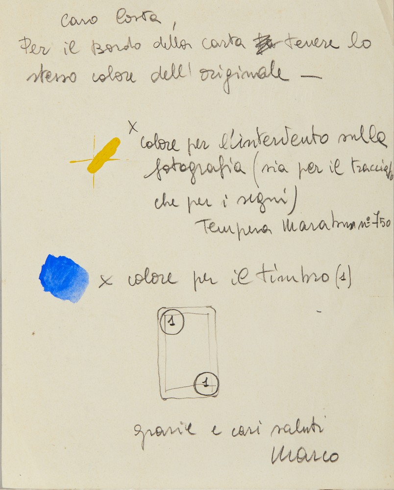 il secondo foglio che compone l'opera è una lettera con indicazioni per la realizzazione della carta da gioca, scritta a matita con due macchie di colore; dimensione : 22,5x 18 cm