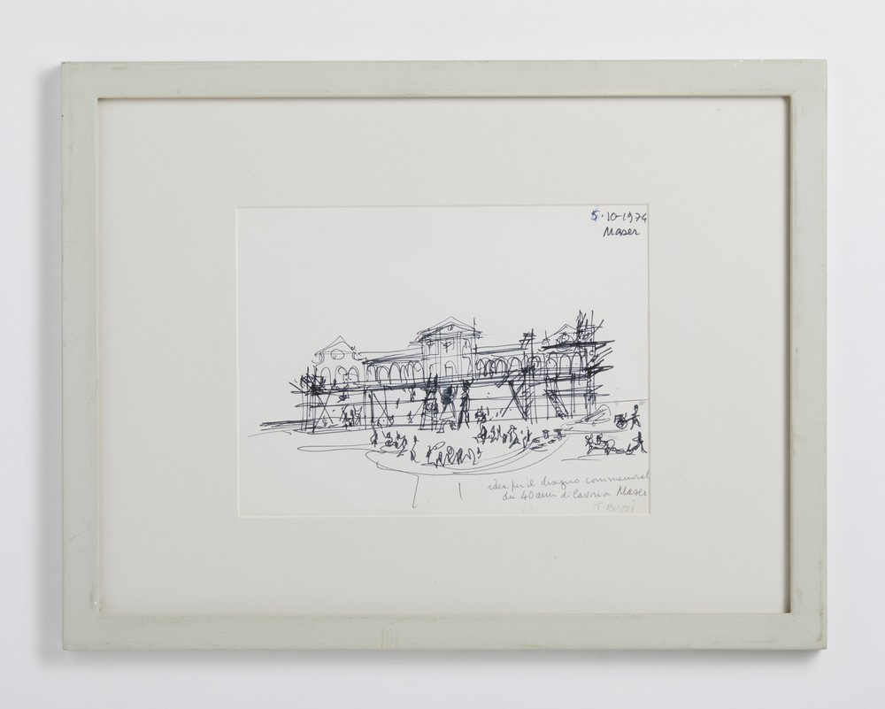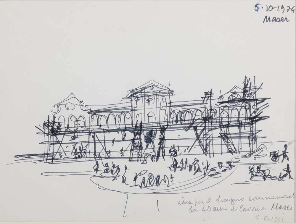 BUZZI TOMASO (1900 - 1981) IDEA PER IL DISEGNO COMMEMORATIVO DEI 40 ANNI DI LAVORI A MASER. 1974. mista su carta. Cm 24,00 x 17,50. firma, data e titolo. Cornice presente