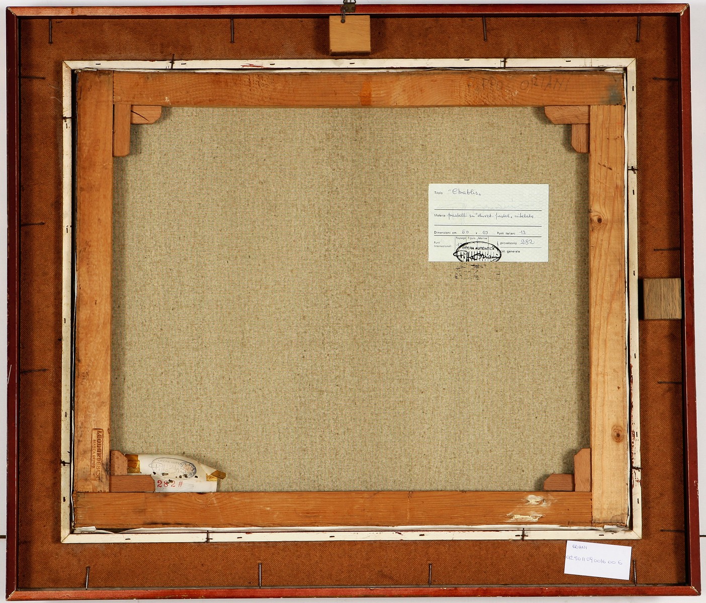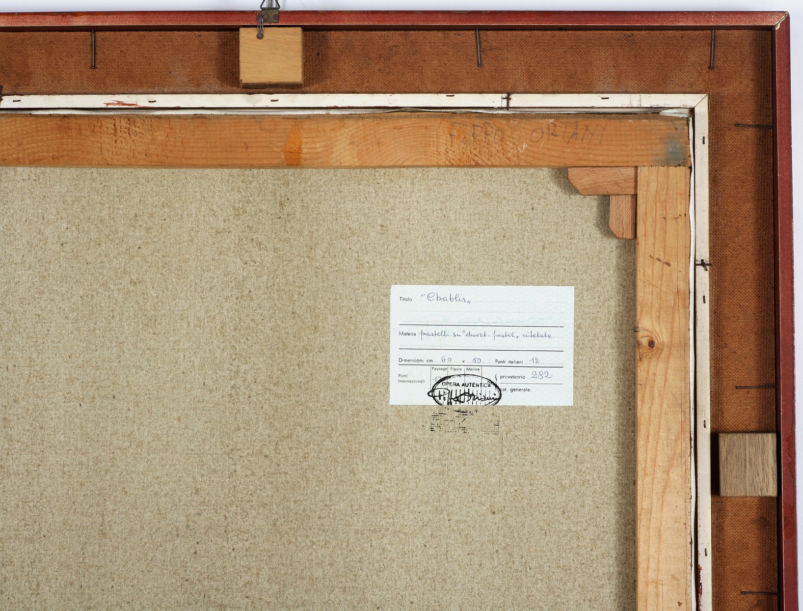 Firma in basso a destra. Al retro cartiglio Pippo Oriani con dati identificativi dell'opera e numero d'archivio provvisorio; timbro "per autentica Pippo Oriani". Cornice presente.