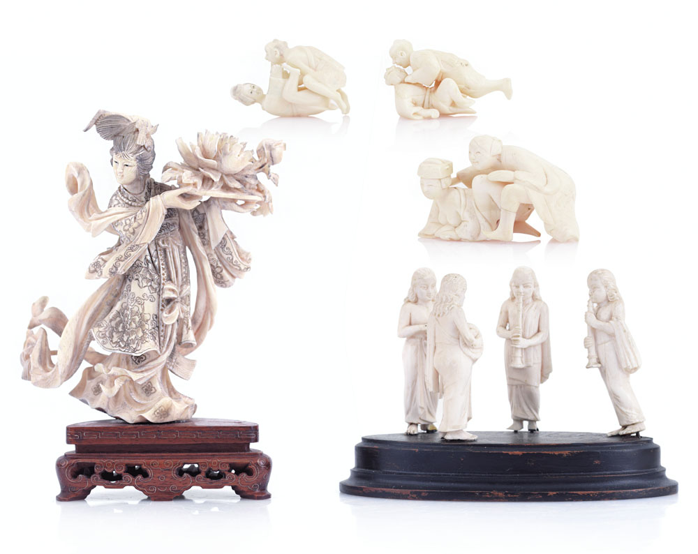 LOTTO DI DIVERSI OGGETTI IN AVORIO, XX SECOLO, composto da una Kwan Yin, tre gruppi erotici e quattro suonatori su base in legno; rottura e sbeccature.