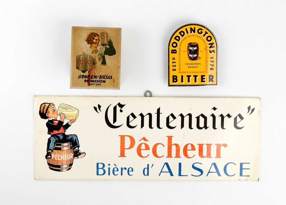 Lotto di tre oggetti pubblicitari : una tabella in latta litografata Biere d'ALSACE cm.36x13,5 ; un segnaposto in lamiera litografata Spaten Brau Munchen misure cm.10x7,5 ; una targhetta in metallo BITTER BODDINGTONS est.1778 Brewed in Manchester misura cm.10x8