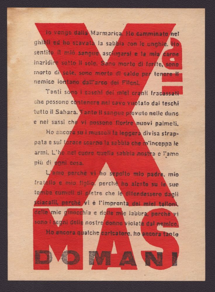 Volantino propagandistico per la X° MAS. In carta litografata ad inchiostro nero e rosso per la X° MAS (Decima MAS) - "Io vengo dalla Marmarica. Ho camminato nel Ghibli ..." - Misure circa cm.8x11, in perfette condizioni, originale degli anni '940