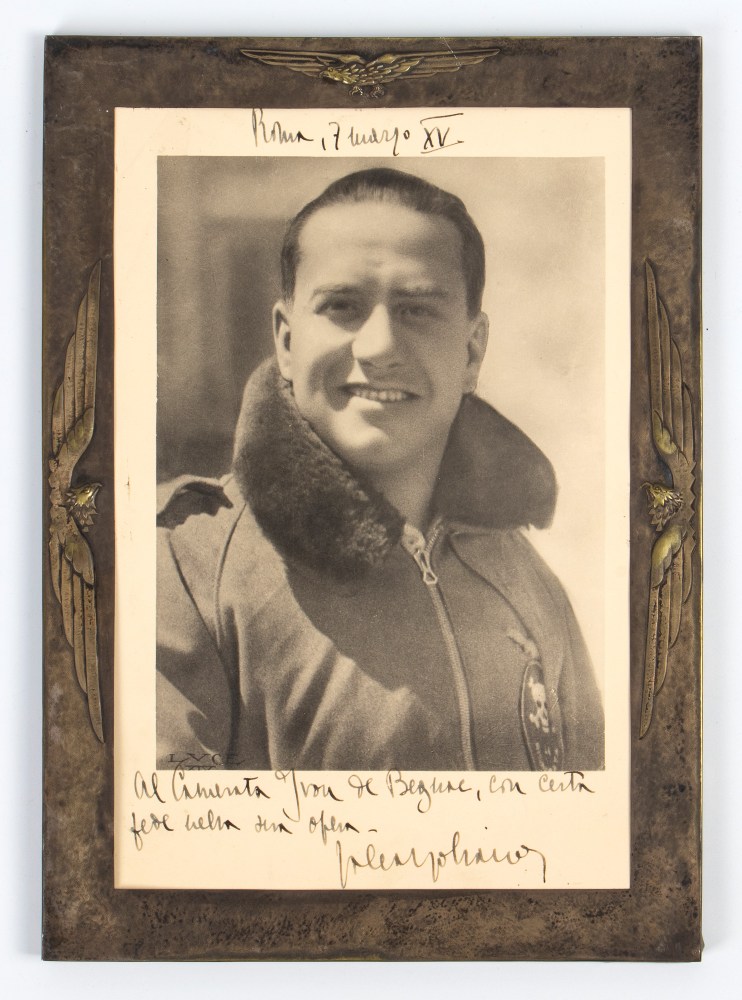 Foto in b/n di Galeazzo Ciano, in uniforme di volo della Regia Aeronautica con giaccone Marus e logo al petto della Squadriglia LA DISPERATA, applicata su cartoncino rigido, con dedica e firma autografe ad inchiostro nero "Al Camerata Ivon De Begnac con certa fede nella sua opera - Galeazzo Ciano - Roma 7 Marzo XV" - La fotografia è inserita in una straordinaria cornice coeva, in metallo sbalzato a mano, avente tre aquile simbolo della Regia Aeronautica, ad ali aperte, ai lati destro e sinistro ed al lato superiore. Misure della cornice circa cm.32x45. Foto LUCE
