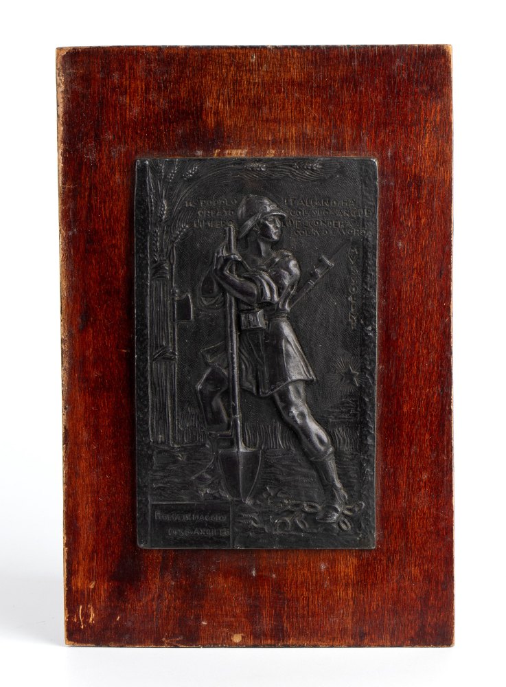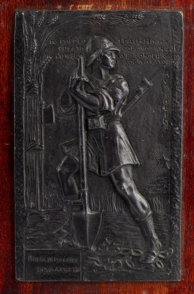 Placca in zama, montata su supporto in legno, insieme coevo ed originale, che ritrae un soldato italiano camicia nera in uniforme coloniale, atto a lavorare la terra con una vanga, e circondato da spighe di grano e da un fascio littorio alla sua sinistra. La placca reca incisa la frase IL POPOLO ITALIANO HA CREATO COL SUO SANGUE L'IMPERO - LO FECONDERA' COL SUO LAVORO - MUSSOLINI - 9 MAGGIO 1936