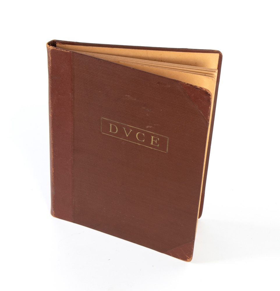 Cartella in cartone rigido, rivestita in similpelle, con stampa DUCE in riquadro incisi al piatto a caratteri similoro, con pagine in cartone per inserire le lettere che dovevano essere portate all'esame di Mussolini e conseguentemente alla sua approvazione (o no) per la firma. Originale del ventennio fascista, in ottimo stato. Misura circa cm. 26x35