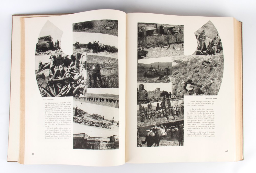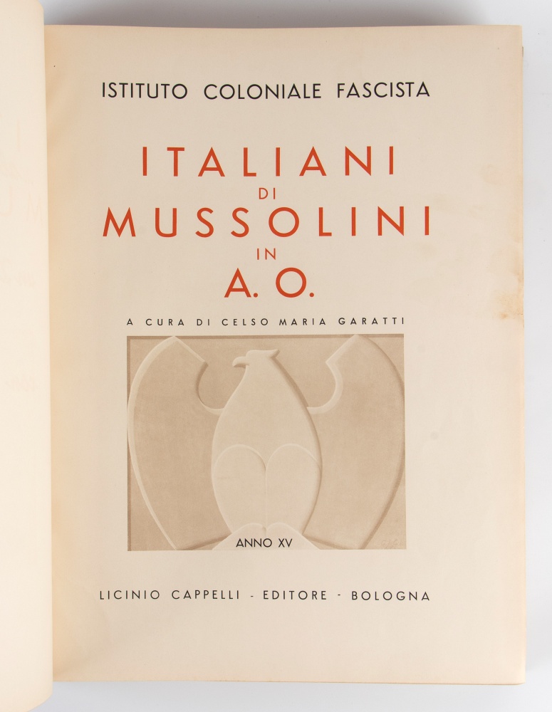 Volume monumentale dal titolo ITALIANI DI MUSSOLINI IN A.O. Edizione di lusso numerata 24, copertina in tela beige, dorso e piatto con fascio littorio applicato (lamierino d'ottone , legno). Pubblicazione dell'Istituto Coloniale Fascista, a cura di Celso Maria Garatti, Anno XV dell'era fascista (1937).