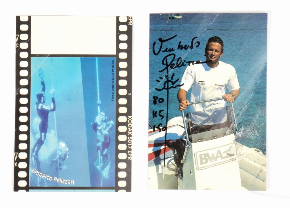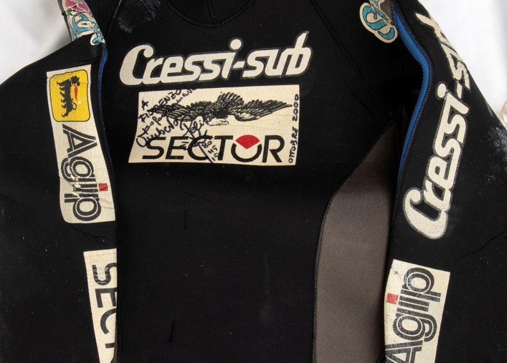 Equipaggiamento originale appartenuto a Umberto Pellizzari usato nel 2000 durante la realizzazione del film IMAX (2D) dal titolo OceanMen insieme al "rivale" Pipin Ferreras. Muta Cressi Sub composta da "giacca" e pantaloni con sponsor CRESSI, Agip, Sector, firmata con dedica ed autografo originali scritti di pugno con pennarello nero UMBERTO PELLIZZARI 80 115 150 ad indicare le profondità raggiunte nei records. In aggiunta un paio di occhiali ed un profondimetro MARES usati sempre da Pellizzari, con una foto cartolina autografata in originale UMBERTO PELLIZZARI 80 115 150. Materiale usato, in ottime condizioni.