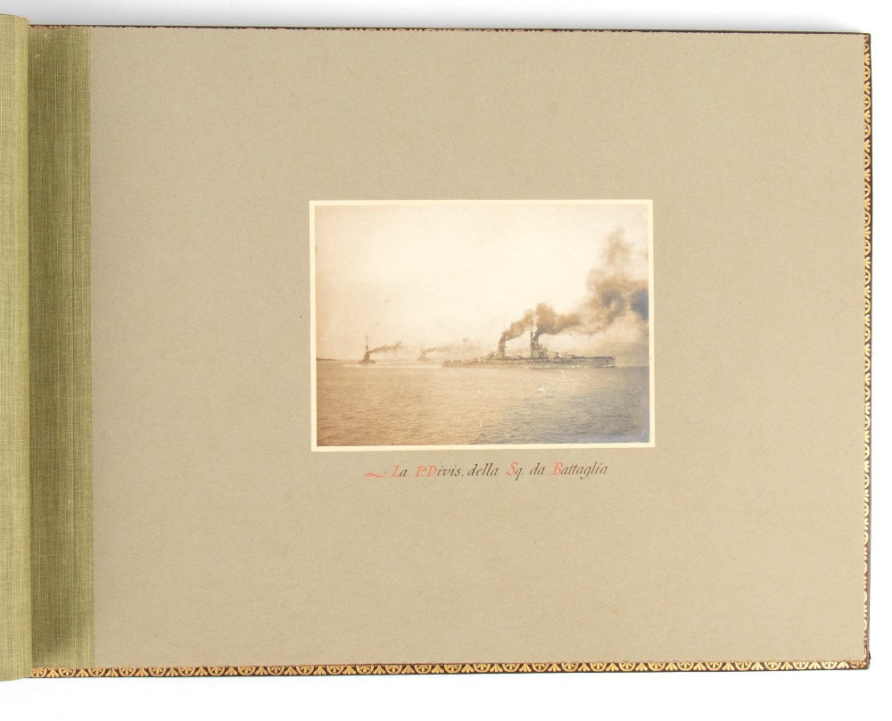 Album fotografico con 11 fotografie di navi della Regia Marina, periodo 1918 1919, con didascalie. Copertina con titoli impressi in similoro. Misure dell'album circa cm.34x46