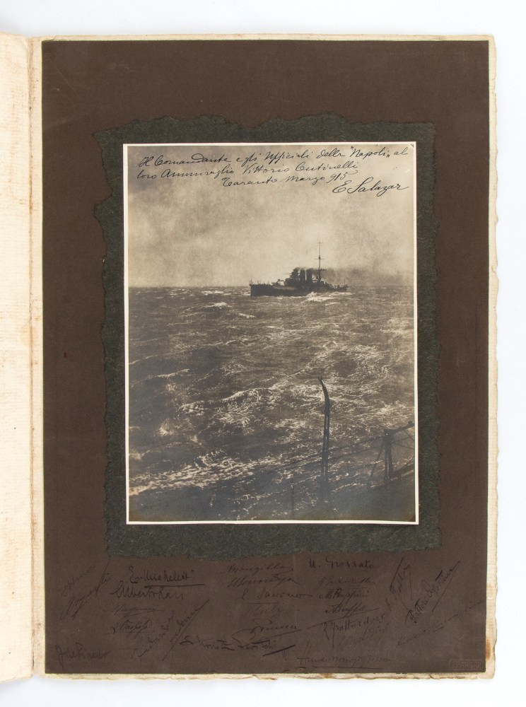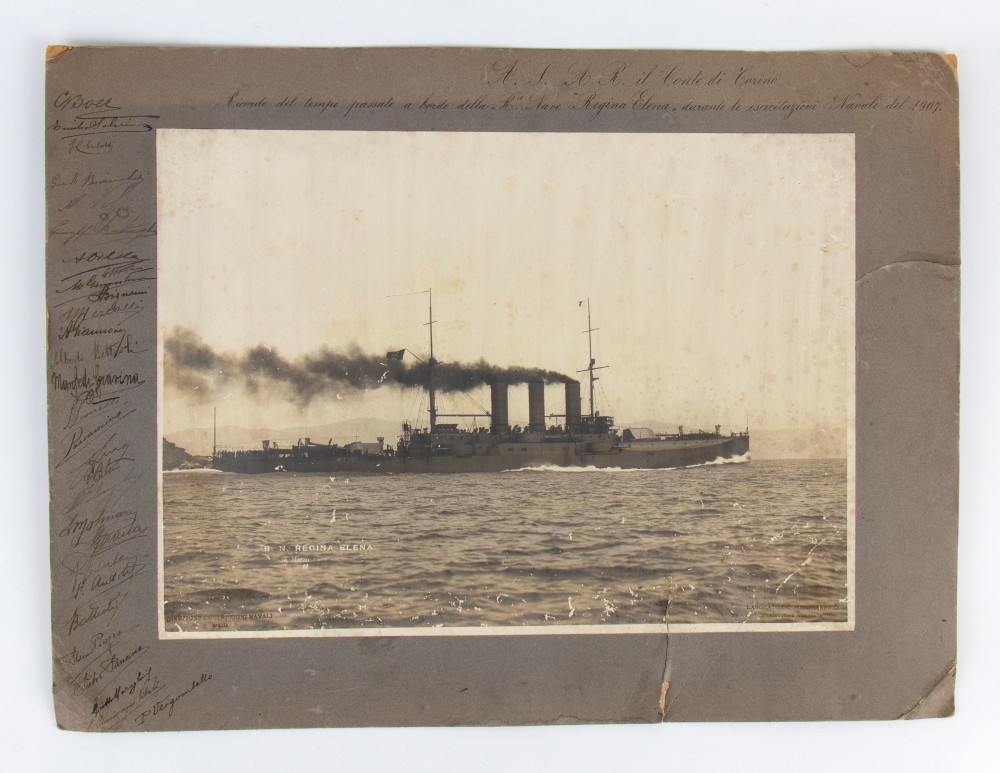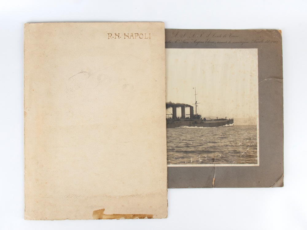 Lotto di due fotografie della R.N. Napoli e della R.N.Regina Elena, con copertina, e firme autografe. Misure circa 40x30