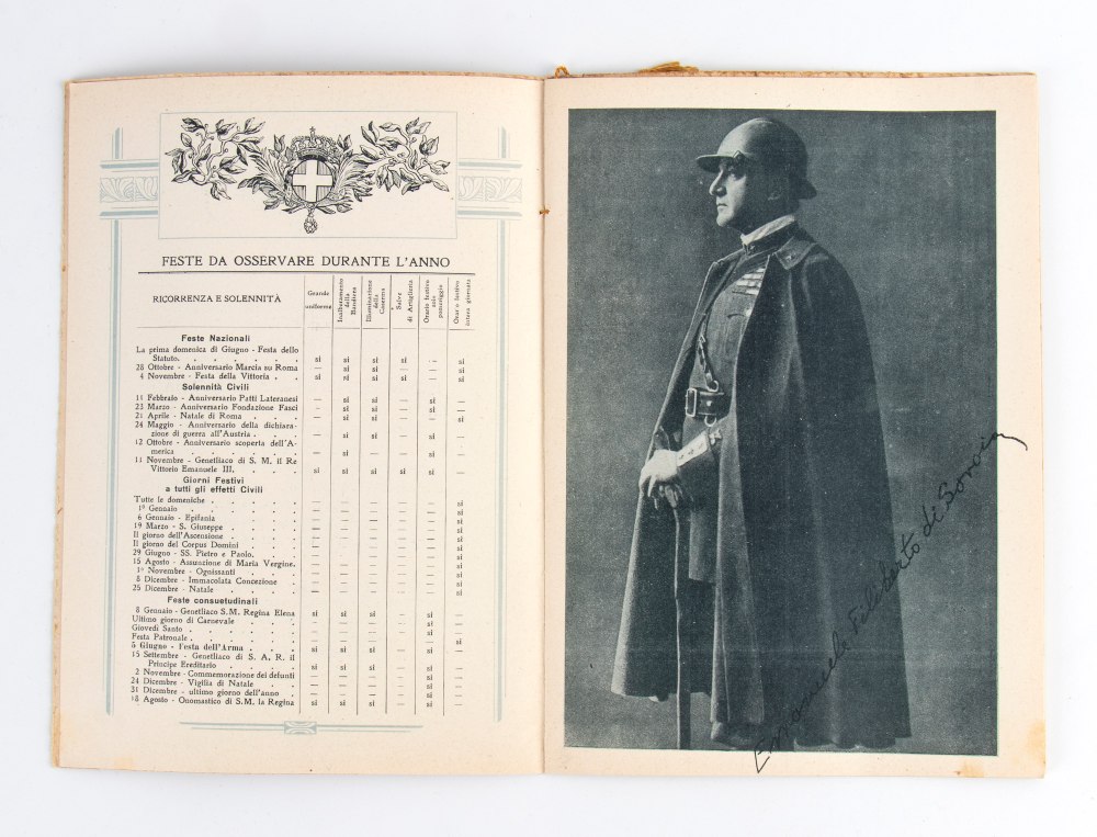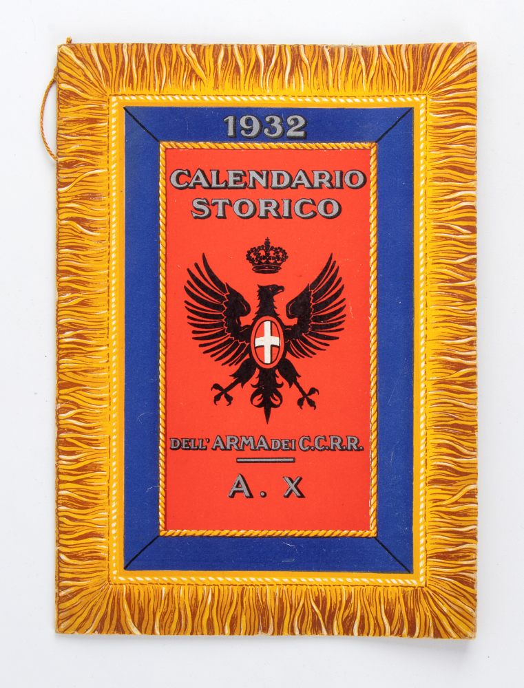 Calendario storico dei Carabinieri Reali CC.RR. per l'anno 1932, ANNO X era fascista, dimensioni circa cm 24x17, con cordino corto (prima edizione) giallo originale. Rarissimo calendario, originale del 1932, completo di tutte le pagine ed in perfette condizioni