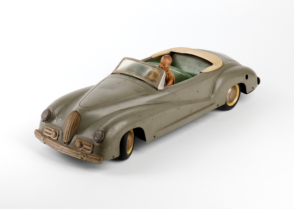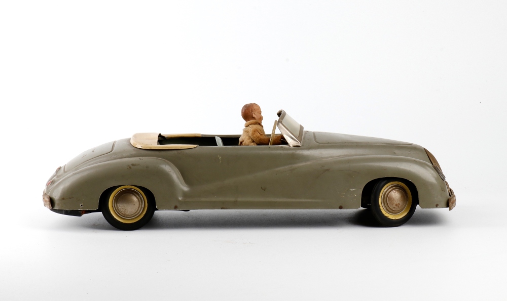 Modello della Alfa Romeo 2500 6C , prodotto dalla Ventura (Preganziol, Treviso) in lamiera e fondello in legno, motore con carica a molla, targata ROMA 1352. Pneumatici in gomma dura, cerchioni, sterzo funzionante, completa di parabrezza originale. In buone condizioni. Lunghezza cm.41 circa