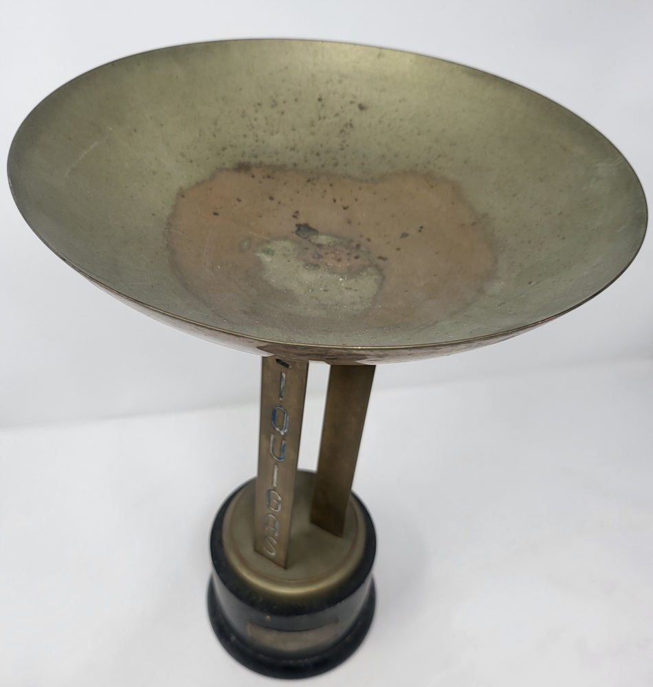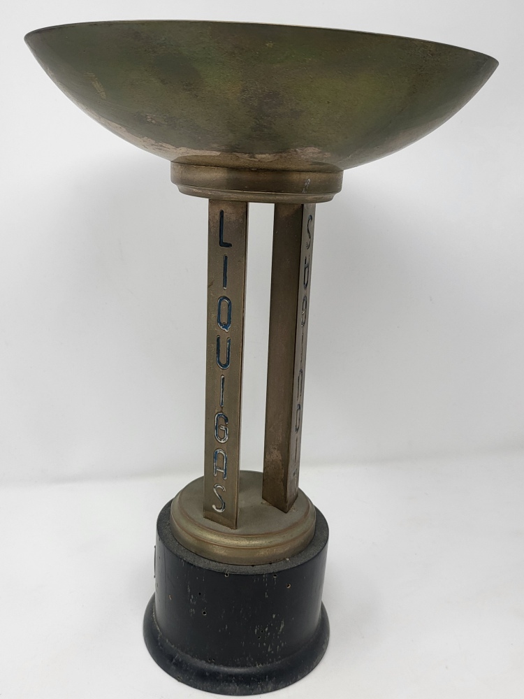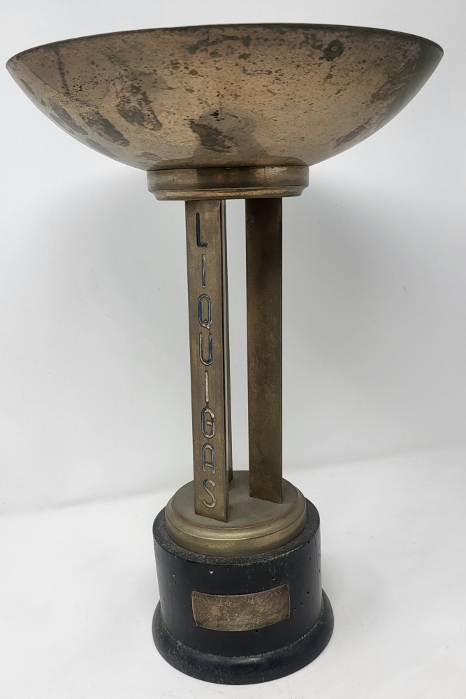 Trofeo LIQUIGAS con targhetta applicata alla base. Trofeo formato da tre colonne di sezione triangolare con la parola LIQUIGAS impressa su ogni colonna, tracce di smalto rosso, coppa che sormonta le tre colonne, base in legno. Trofeo degli anni '940 assegnato fino al 1952 come riporta la targhetta in metallo inciso. Buone condizioni, segni del tempo. Misura circa cm.35 in altezza.