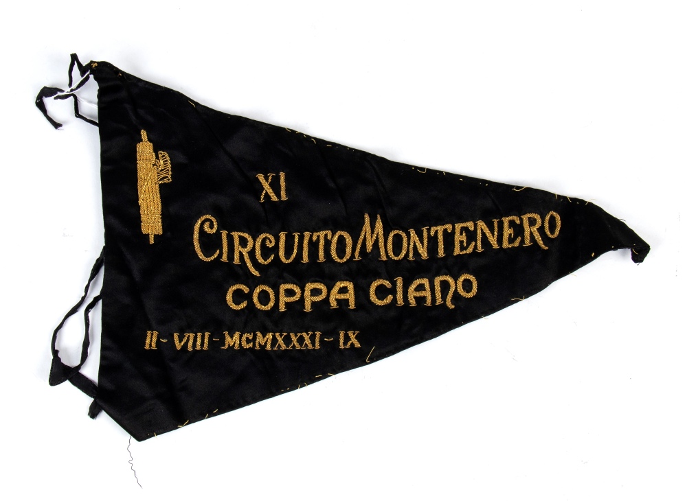 Bandierina da madrina di corsa automobilistica (Coppa Ciano, circuito Montenero). In seta e ricami in canottiglia dorato. Ottimo stato.