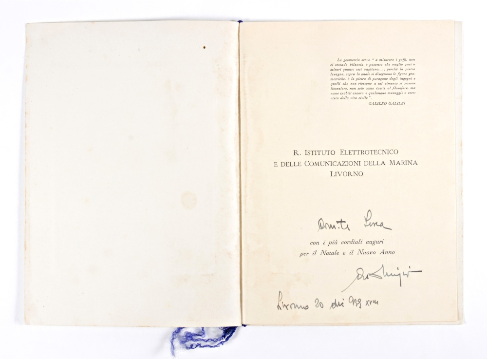 Calendario con dedica del Regio Istituto elettrotecnico e delle comunicazioni della Marino, Livorno 1940.
