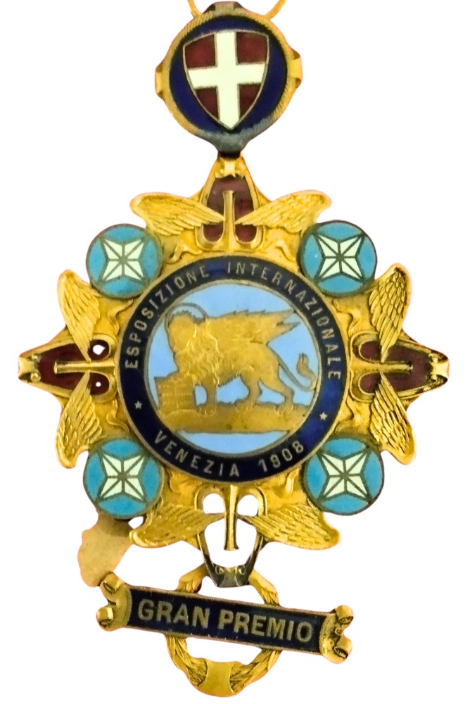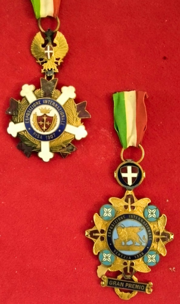 Lotto di due medaglie premio per l'esposizione internazionale di Pisa del 1907 e di Venezia del 1908. In bronzo dorato e smalti policromi; in ottimo stato, conservati in cornice. Dimensioni della cornice: 23x41 cm.