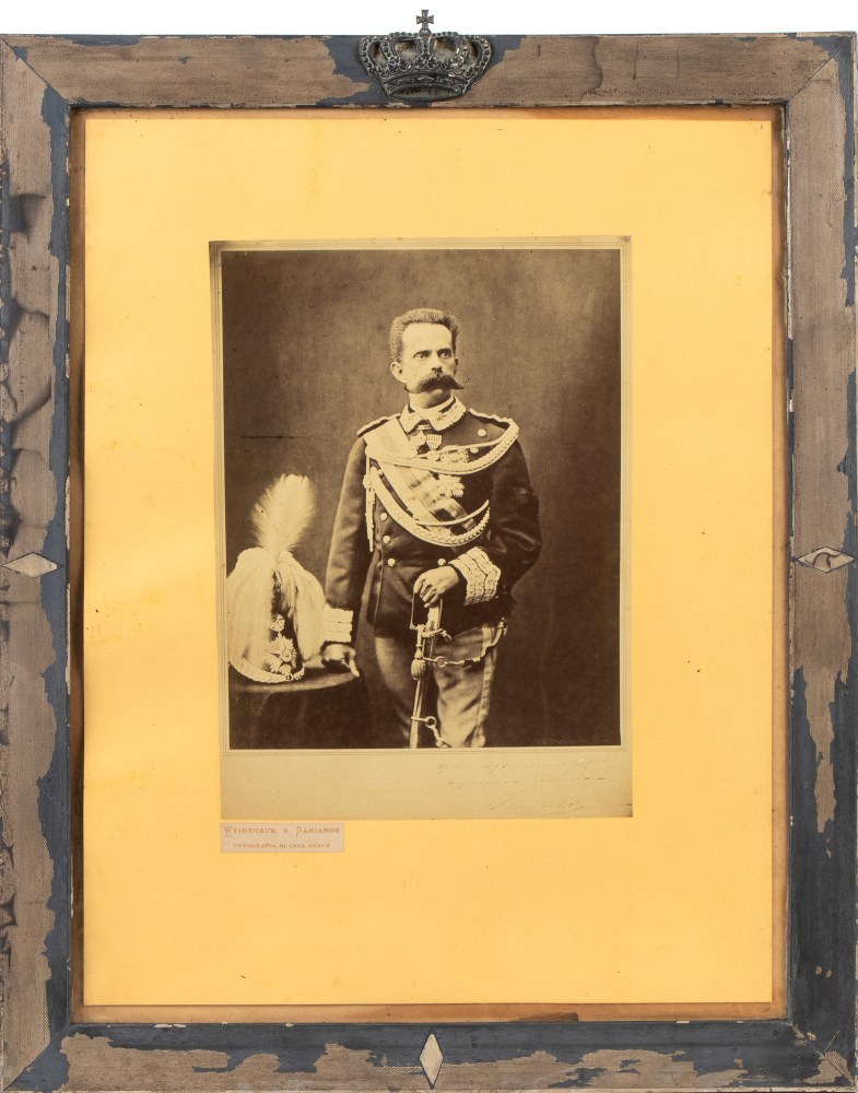 Fotografia di Re Umberto I in divisa da generale; firmata dal fotografo Weintraub; presenza di una dedica evanescente, non leggibile; in cornice coeva in argento ornata di corona reale, dono del sovrano.