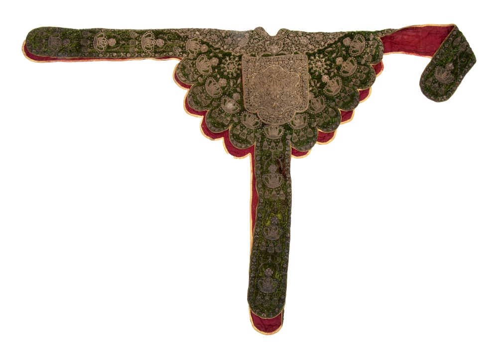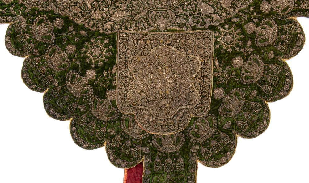 Antica bellissima stola cerimoniale per membro della casa Imperiale Etiope, in velluto verde con impressionanti ricami  floreali e corone imperiali di canottiglia argento, foderata all'interno di tela multicolore. In ottimo stato, rara di così grande qualità.