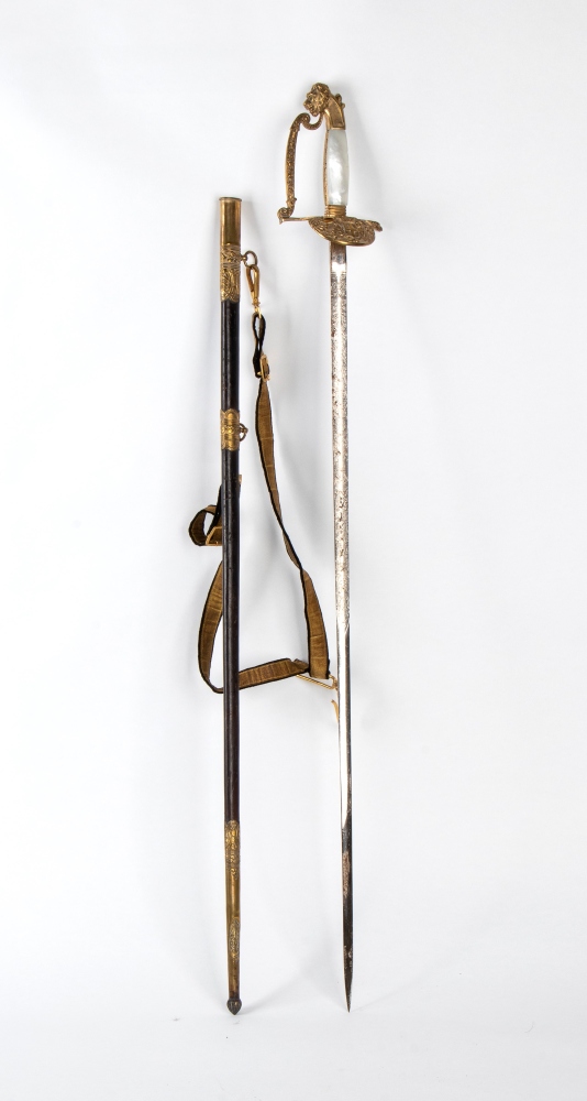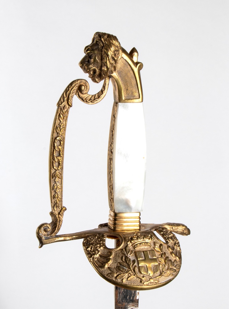 Bello spadino con impugnatura a testa di leone, guanciole di madre perla e pelta decorata di scudo savoia, fodero di pelle con inserti metallici dorati. In ottimo stato, di libera vendita in quanto, oltre ad essere un oggetto di rappresentanza, è privo di filo e punta.