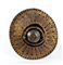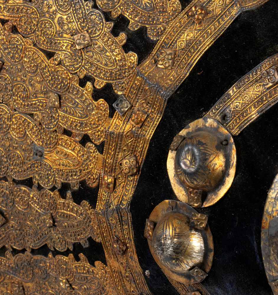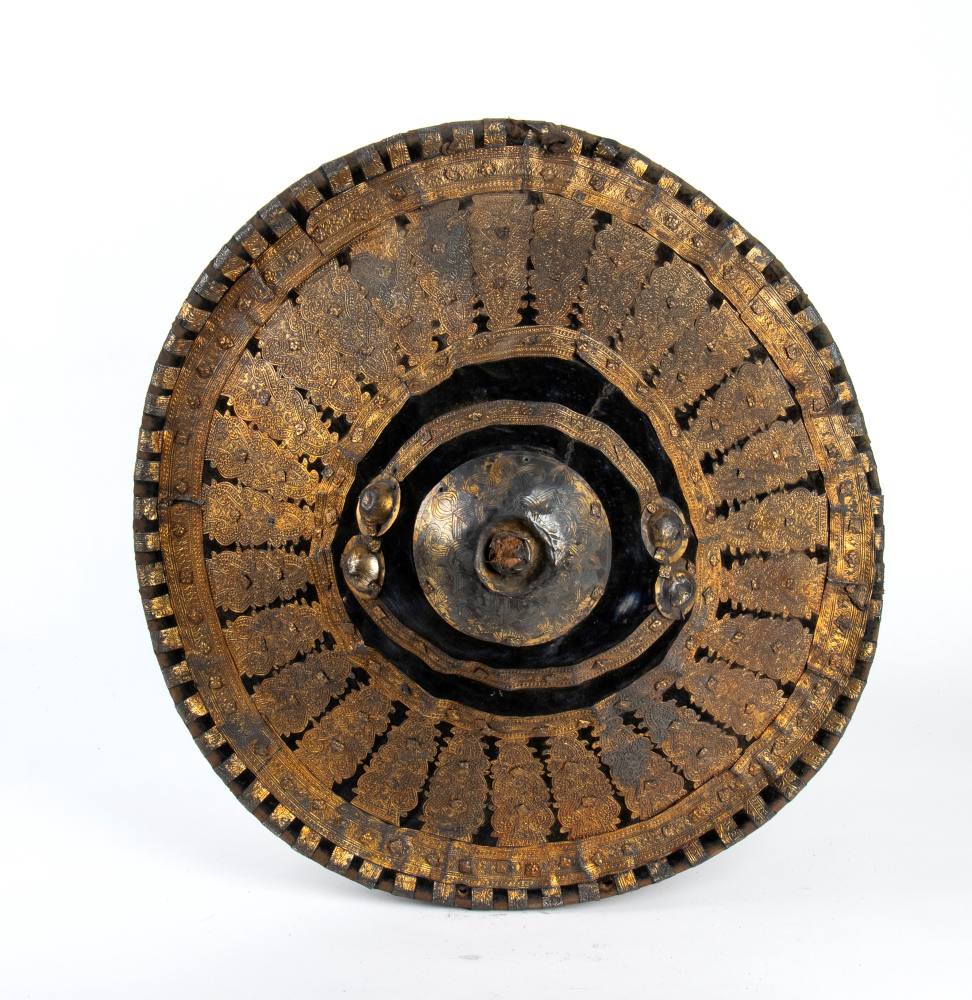 Bellissimo scudo da ras, corpo in pelle foderato di velluto molto scuro, tendente al nero, decorato con applicazioni metalliche in metallo traforato e dorato. Molto bello; in ottimo stato.