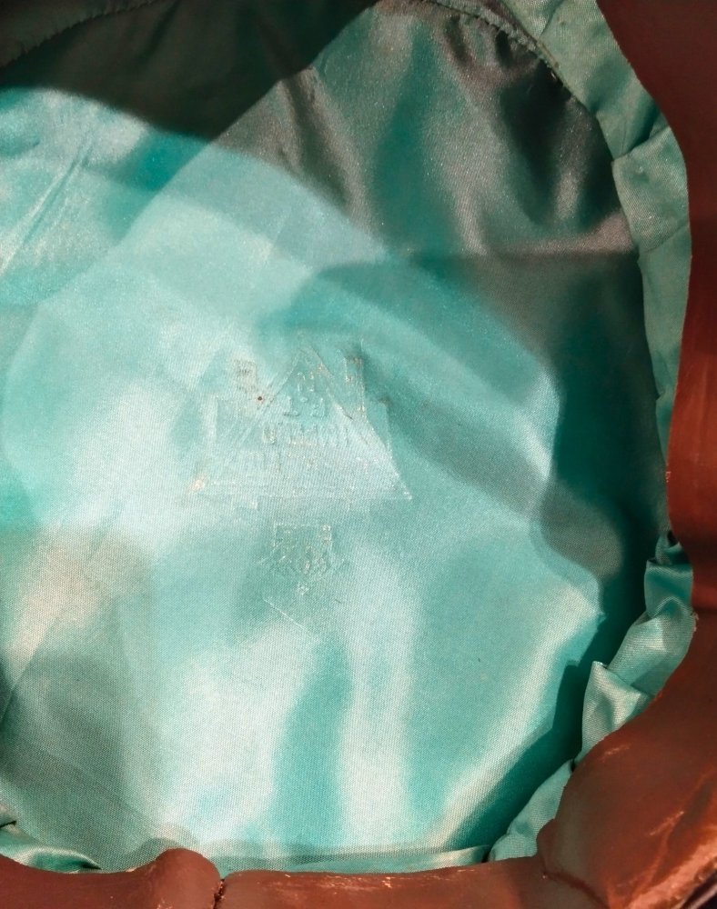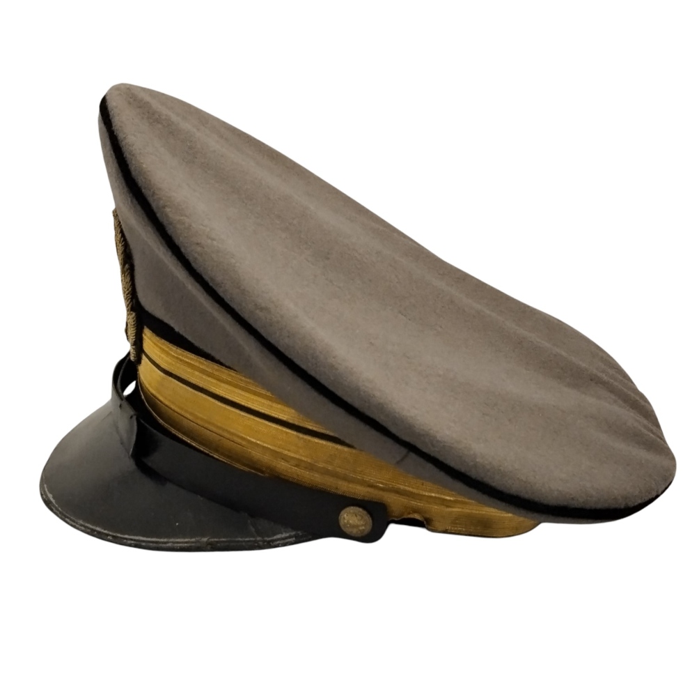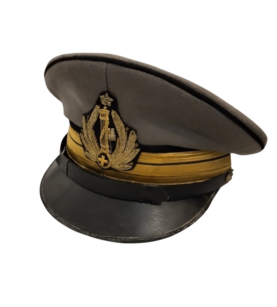 Confezionato in panno di lana grigio di bassa qualità, profilato al tondo, tamburo di panno nero con gradi da primo seniore e fregio ricamato in canottiglia dorata su panno nero, soggolo con bottoncini pertinenti, fodera di seta con marchio del fabbricante non più visibile, in buono stato.