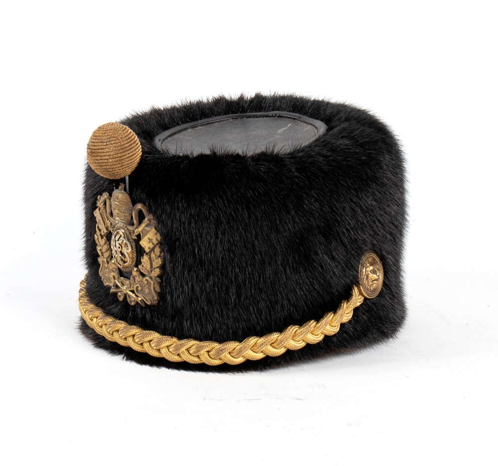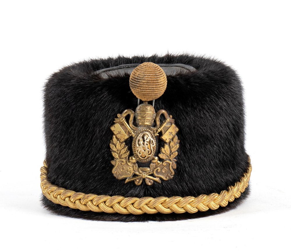 Bellissimo colbacco in pelo naturale con fregio metallico dell'arma, cordone frontale applicato a due mascheroni a forma di testa di leone, nappina in grovigliola, interno di seta col marchio del fabbricante e stemma del papa regnante, Pio XII. In ottimo stato.