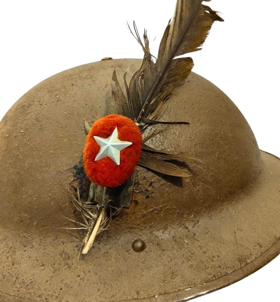 Rarissimo elmetto MKL2 di fabbricazione inglese utilizzato dagli alpini del Corpo Italiano di Liberazione, poi inquadrati nel gruppo di combattimento Legnano, in acciaio balistico verniciato in vernice marrone antiriflesso con porta nappina in latta di ferro saldata a stagno con inserita nappina di lana rossa caricata di stella di alluminio con penna, fregio frontale degli alpini a mascherina, all'interno cuffia a dente di lupo di fattura italiana montata su supporto a croce ed applicata all'elmetto con vite cupolare, completo di soggolo. In buono stato, molto raro.