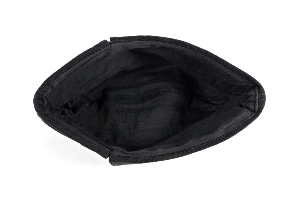 In tessuto di gabardin nero con fascio metallico frontale e scudetto da capo-nucleo applicato di lato, modello semplificato senza alluda; in ottimo stato.