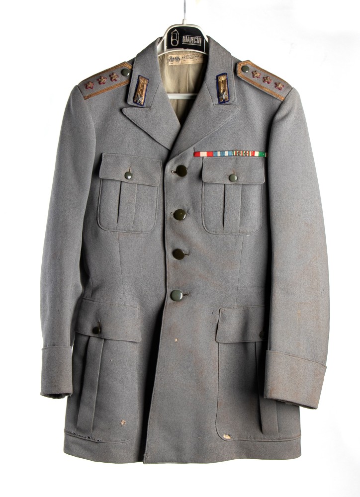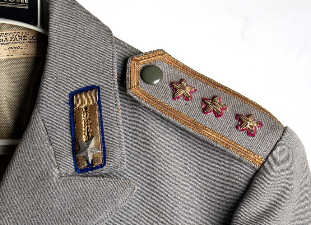 In cordellino di lana, bavero con alamari specifici del servizio, controspalline fisse bordate di galloncino dorato, stellette in canottiglia dorata su fondo di panno robbio. Piccoli danni, buchi di tarma alla tasca destra inferiore, altrimenti in ottimo stato.