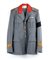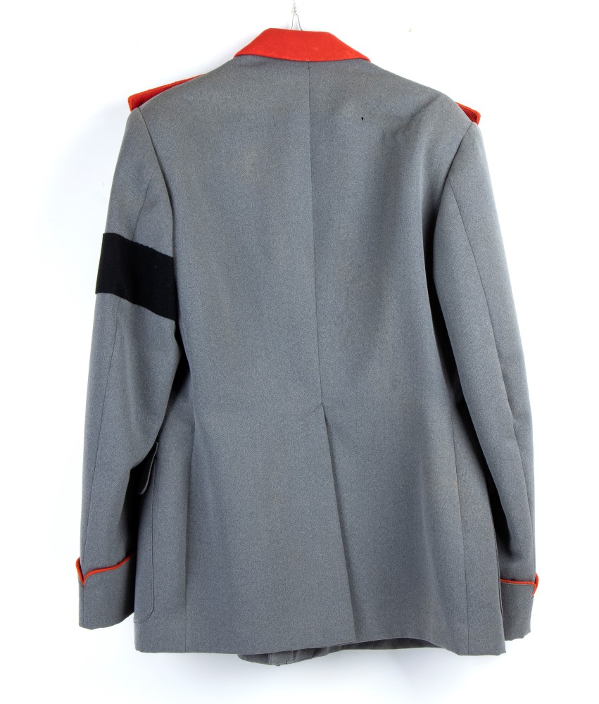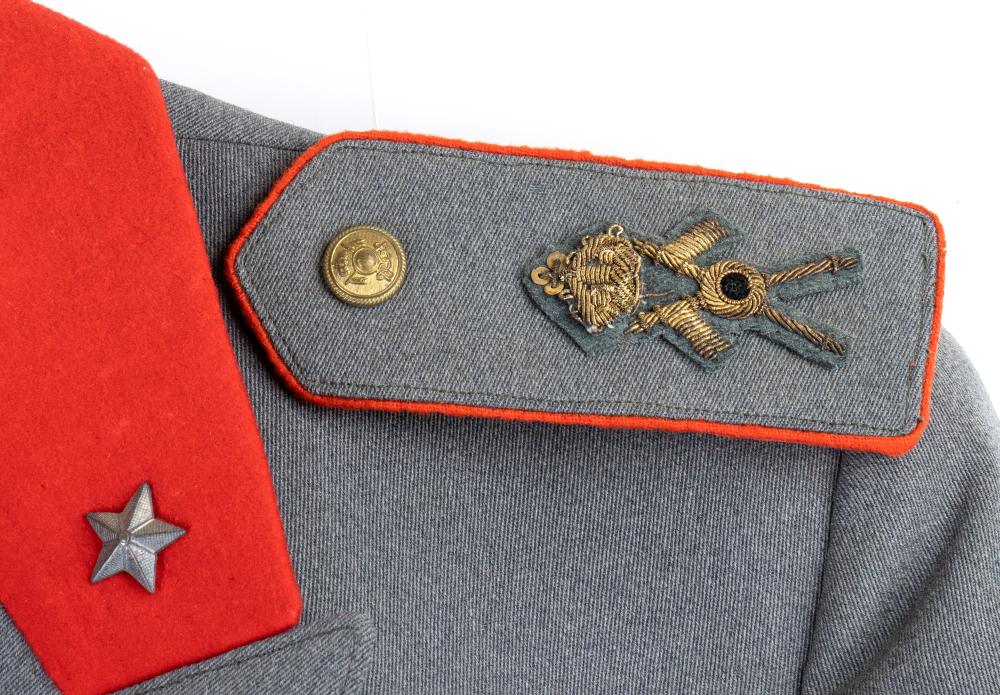 Bellissima giubba da ufficiale dei lancieri di Aosta, in cordellino grigio con bavero e filettature rosso scarlatto, gradi alle maniche, controspalline con fregio di arma in canottiglia dorata. In ottimo stato.