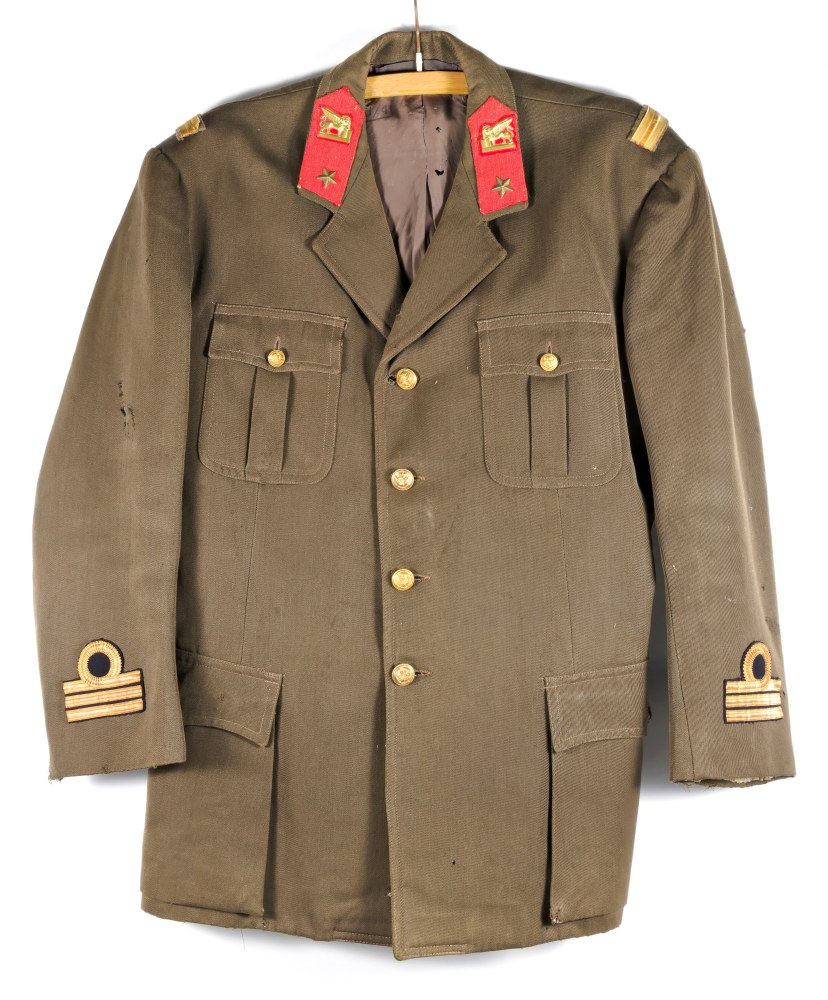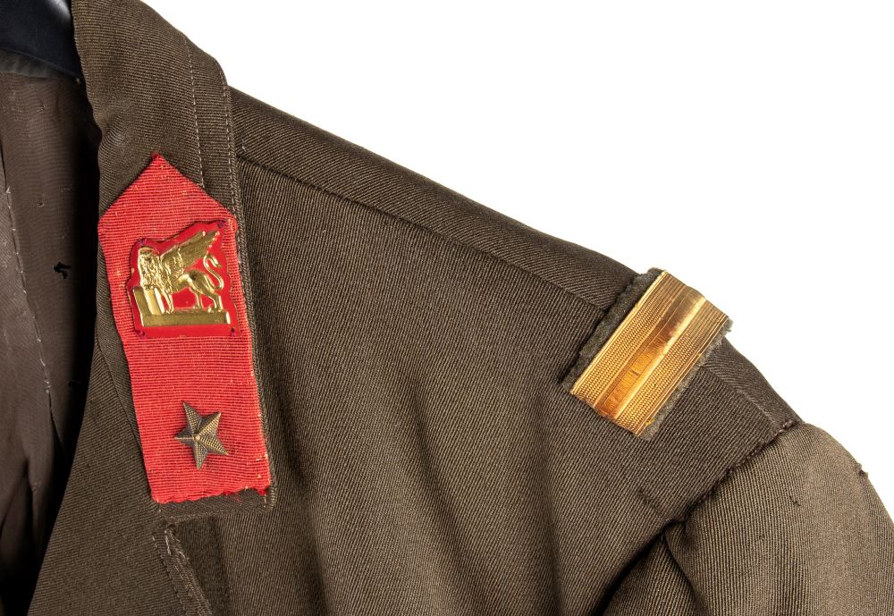 Rara uniforme di transizione m. 34/40 in cordellino coloniale, giubba a 4 tasche con mostrine e scudetto da ufficiale ricamato in canottiglia dorata su panno rosso della divisione Sirte, bottoni metallici m. 34 col simbolo di fanteria, controspalline lisce e fisse, pantaloni a sbuffo, giubba perfetta, pantaloni con leggeri difetti dovuti alle tarme. Rara e bella.
