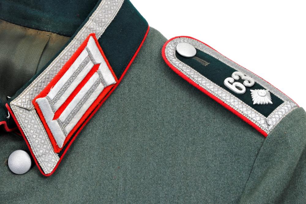 Giubba da parata da sottufficiale di artiglieria, in gabardina di lana feldgrau, collo e paramani di panno verde scuro con applicati alamari in argento e bordi in galloncino metallico argento, profilature rosso scarlatto, colore distintivo dell'arma di Artiglieria, fodera interna verde con stringitori. In ottimo stato.