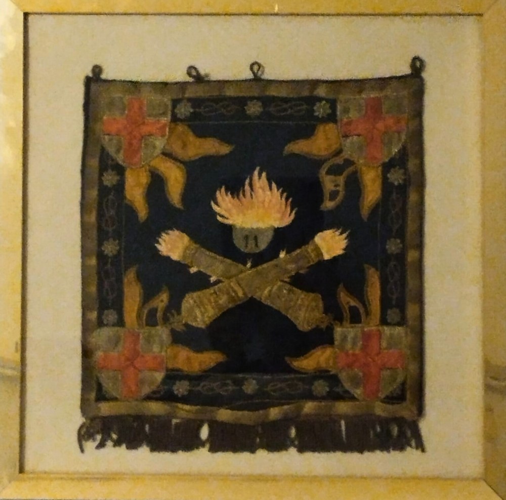 Drappella da tromba dell'11° Rgt artiglieria da campagna "Monferrato", supporto in panno con ricami di cotone e in canottiglia e filato dorato, ottima fattura, conservata in cornice a giorno, l'11° rgt prese parte alla campagna d'Etiopia, cambiata denominazione all'inizio del secondo conflitto partecipa alla campagna contro la Francia per poi essere schierato a sud in funzione di difesa costiera,dopo l'armistizio viene assegnata al gruppo di combattimento 2Legnano"