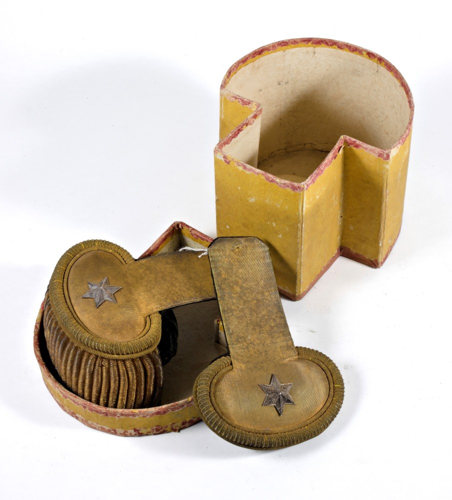 Spallina e mozzetta di gallone dorato caricate allo scudo di stella a sei punte argentata, grovigliola cucita a una delle spalline, conservate in antica scatola, in ottimo stato.