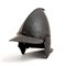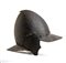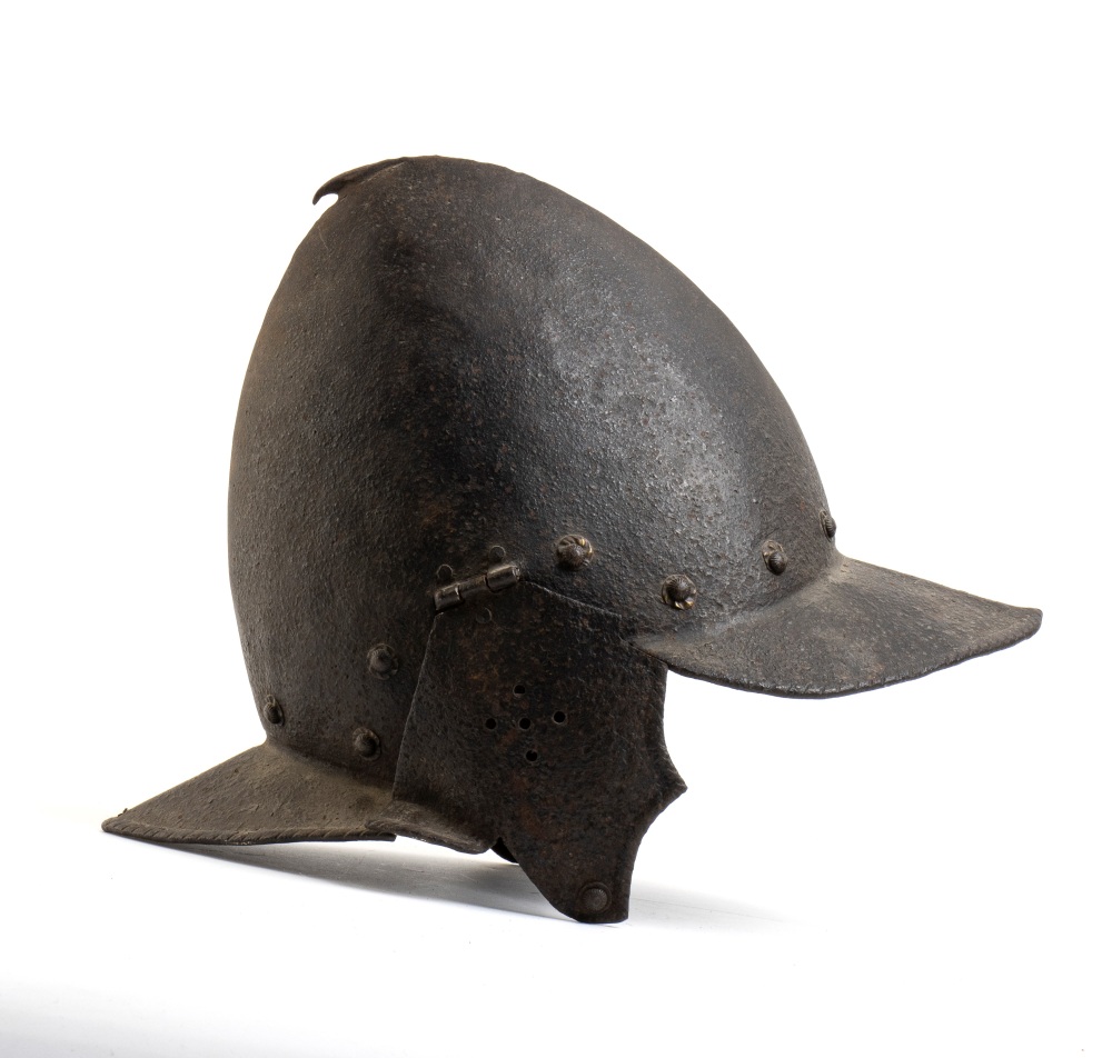Nello stile del XVI secolo, coppo in due pezzi, saldati, visiera con bordo ribattuto al interno, paraguancie sagomati a pipistrello e paranuca con bordo ribattuto. Sono presenti i rivetti per l'applicazione di imbottitura, erosione da ruggine non passante, molo pesante. In buono stato.