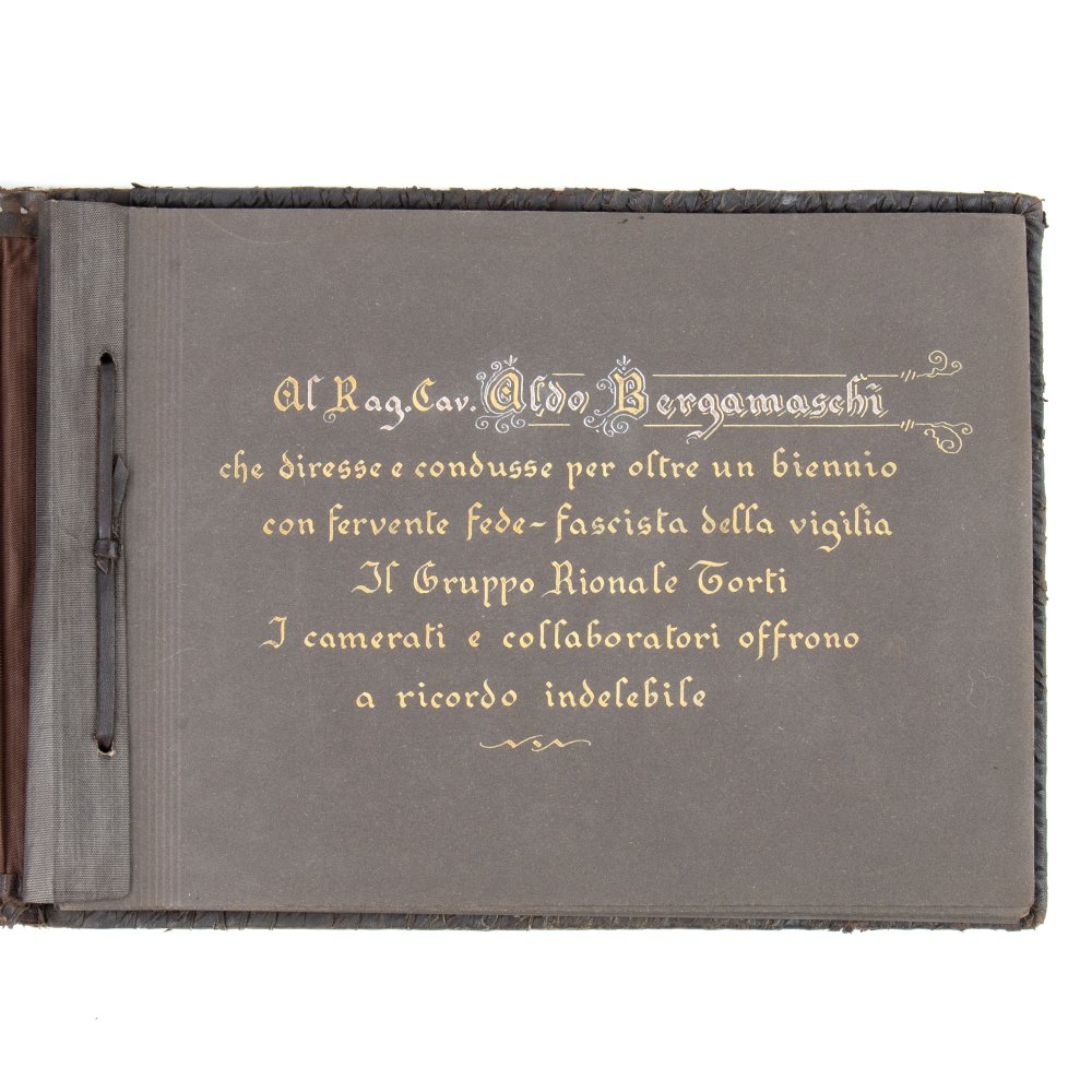 Copertina in pelle sigillata con decorazioni tipiche del ventennio, all'interno dedica e numerose fotografie degli appartenenti al gruppo. Molto bello ed in ottimo stato.