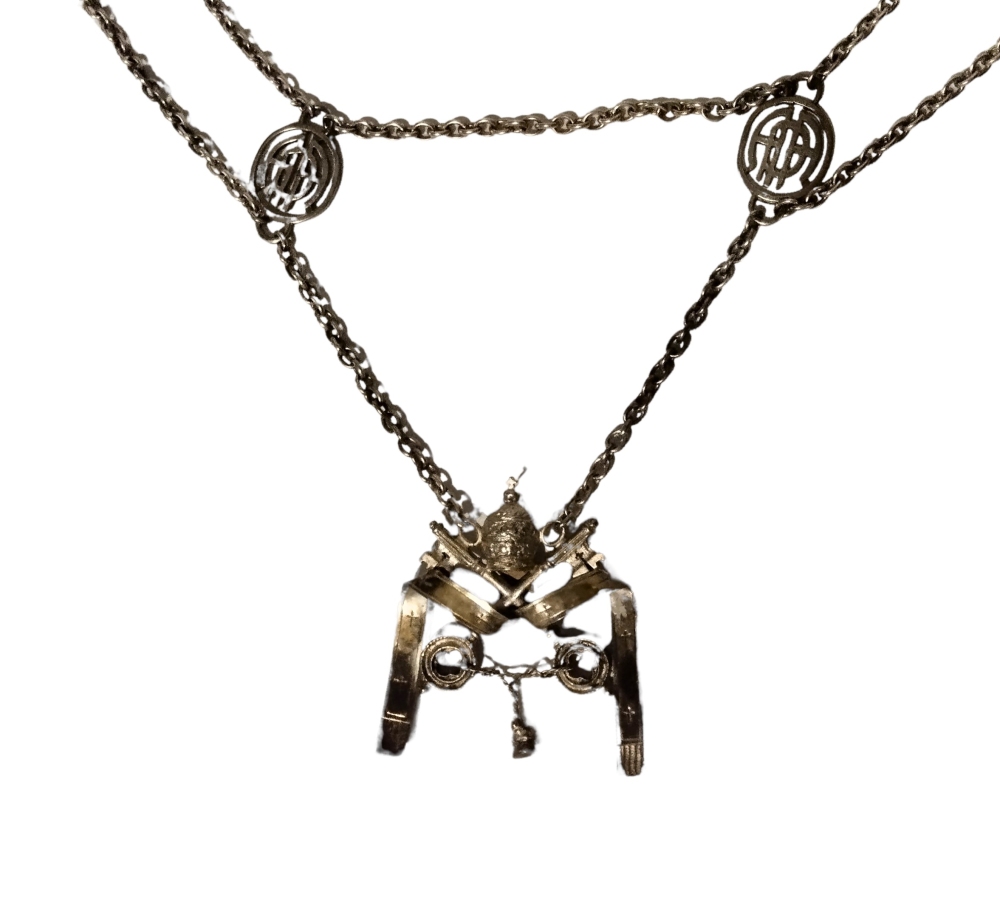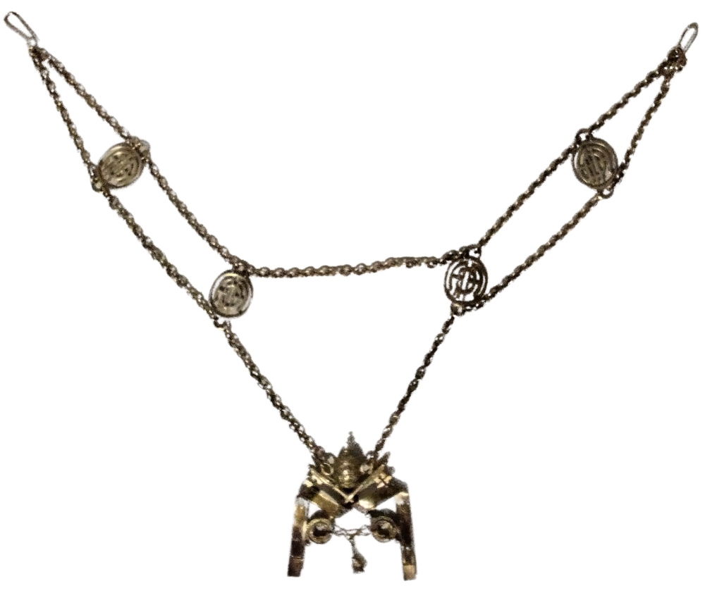 Rarissimo collare da Sediario in argento, formato da pendente a forma di Tiara papale con chiavi decussate assicurato a catenelle alternate a monogrammi, epoca Paolo VI, in ottimo stato. I sediari sono un antico collegio di laici addetti all'anticamera Pontificia e si curano della persona del Papa e del cerimoniale.