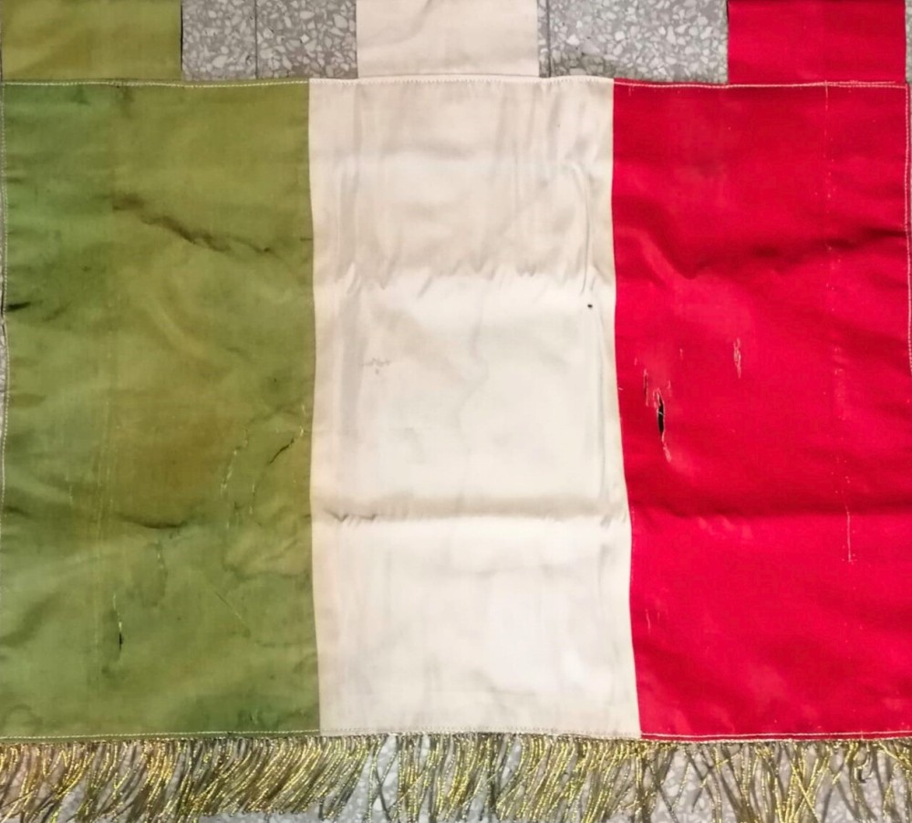 Bel labaro della 107° Legione "Zara", rigatino di seta nera con ricamata aquila su fascio e cartiglio "Legione Zara", bordato di frangia dorata, al verso tricolore di seta, con passanti per il trasporto, 62x45 cm, leggeri segni del tempo, altrimenti in ottime condizioni.