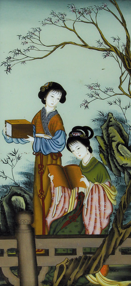 PANNELLO IN VETRO DIPINTO, CINA, FINE XIX SECOLO, decoro a figure femminili entro paesaggio.
