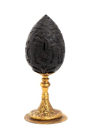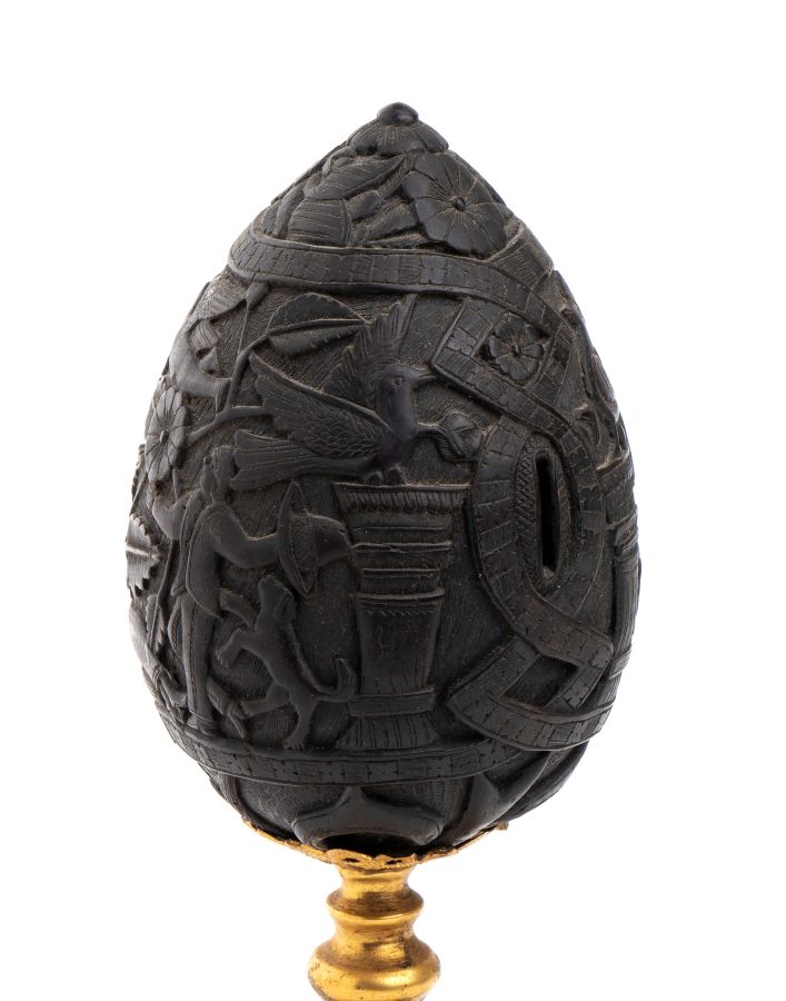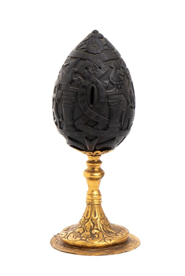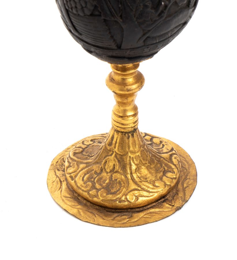 L’uso della noce di cocco intagliata era comune in Europa tra il XVI e il XVII secolo, soprattutto in oggetti di prestigio. Calici di questa tipologia sono spesso associati a un’epoca che va dal XVI al XVII secolo. La lavorazione raffinata della noce di cocco e l’uso del bronzo dorato erano tipici di oggetti prodotti nelle botteghe europee, in particolare in Germania. Classificazione dello stato di conservazione: **** buono.