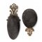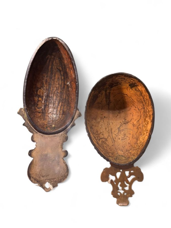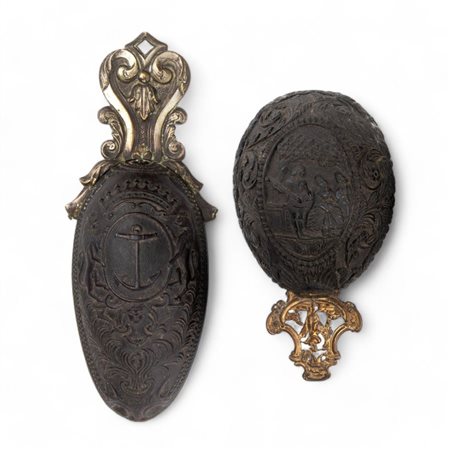 Peso complessivo: 164 gr. di forma ovale, decorate rispettivamente una con motivi araldici con due leoni rampanti e un'ancora centrale, circondati da decori in motivi floreali; una con scena bucolica raffigurante una coppia di figure e un musicista in primo piano con liuto in mano, circondata da decori in motivi floreali. Entrambi le noci sono corredate di manici in metallo lavorato a motivi floreali e uno con figura di pastore.