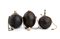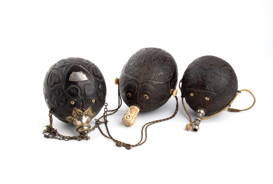 Peso: 530 gr circa. noci di cocco incise e scolpiti a tutto tondo, due raffiguranti due volti con occhi in osso e uno raffigurante uno stemma araldico e motivi floreali con tappo in osso inciso a motivi floreali, con anse di sospensione in ottone e cordini.
