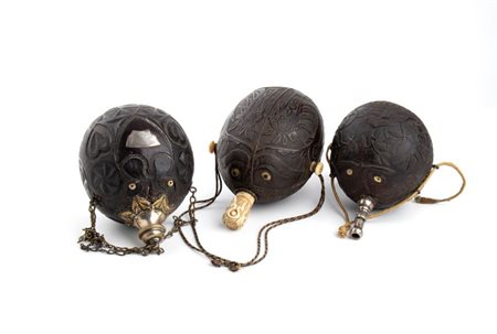 Gruppo di 3 fiasche di noci di cocco incise "del marinaio" Inizio XIX secolo Peso: 530 gr circa.