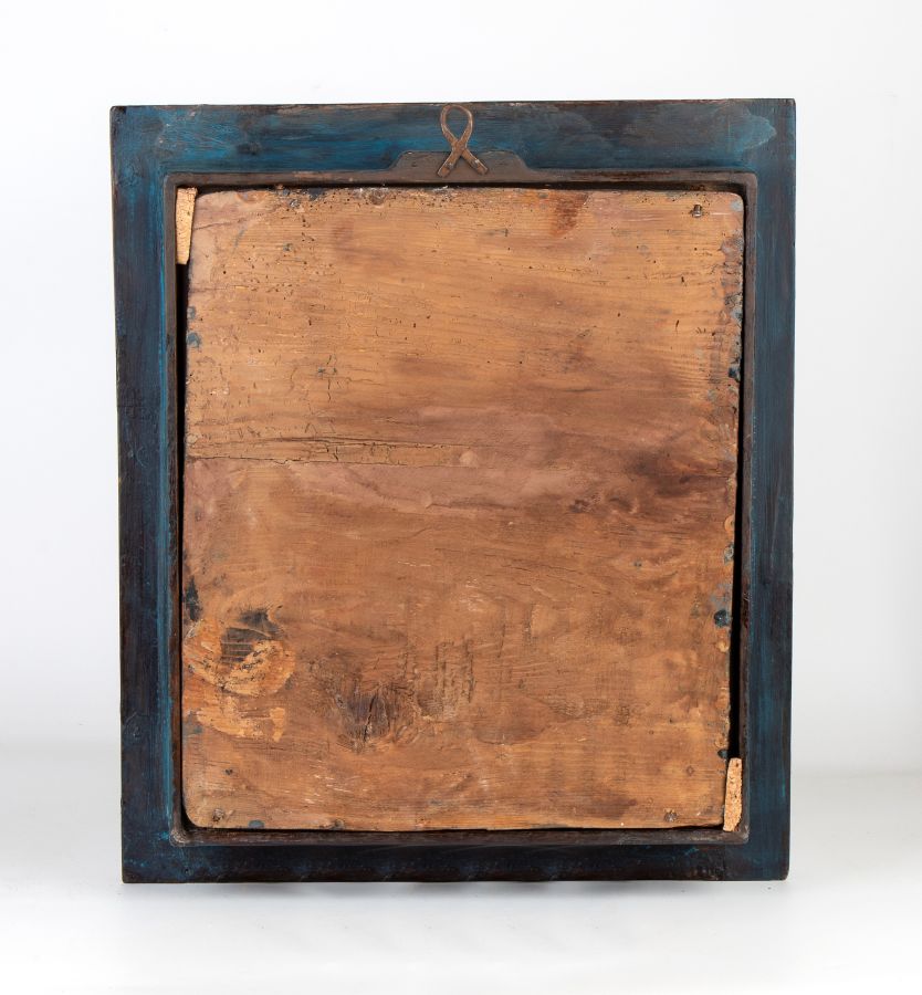 teca in legno dorato e dipinto con colori bluastri contente un bassorilievo in cera policroma raffigurante Martin Lutero a mezzo busto e di profilo, riconoscibile per le vesti.