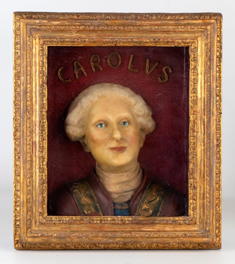 teca in legno dorato posta a protezione e valorizzazione di un altorilievo in cera policroma raffigurante il mezzo busto di Carlo di Borbone, re di Spagna e di Napoli, come riportato in tessuto dorato sul fondo "CAROLUS".