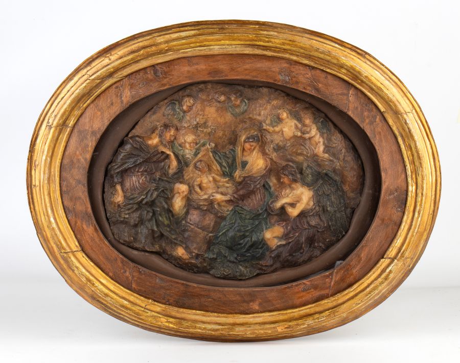 con teca ovale in legno dorato a incorniciare un altorilievo in cera policroma raffigurante la Natività. La composizione raffigura la Madonna e San Giuseppe con al centro Gesù bambino che viene mostrato dolcemente all'Arcangelo Gabriele, con intorno un coro di putti.