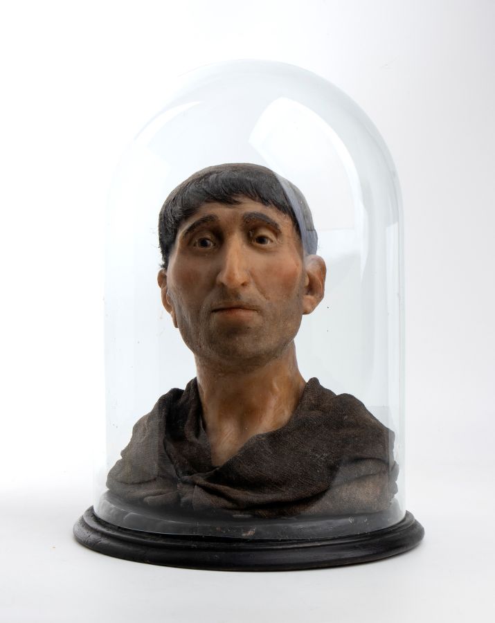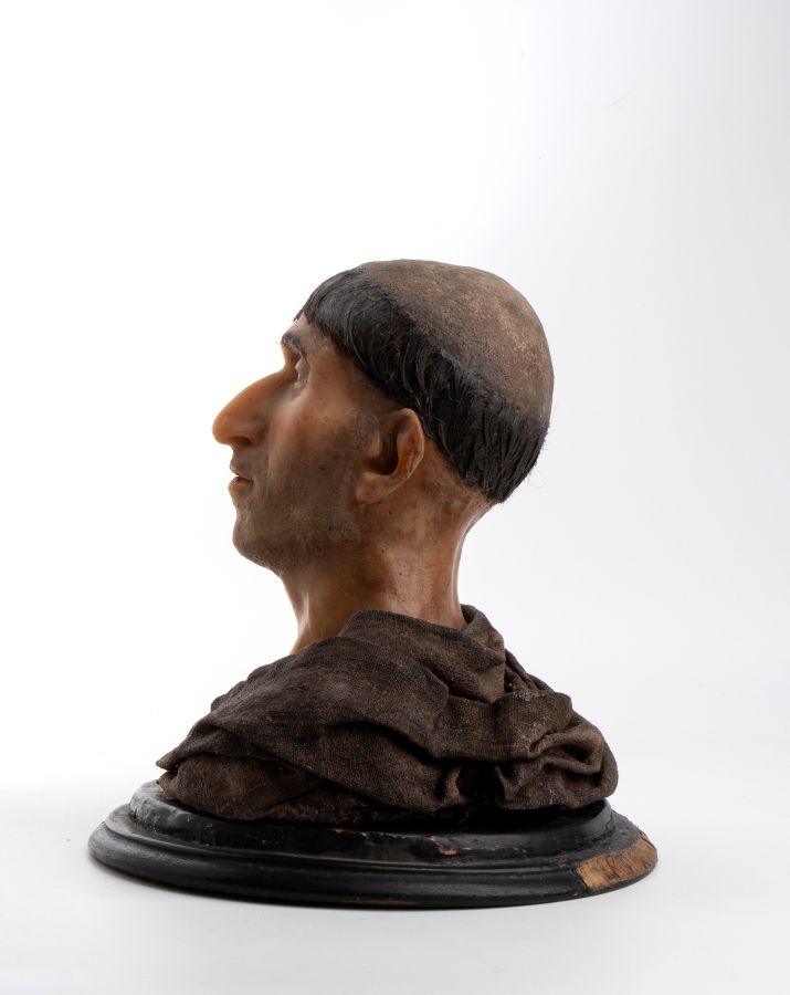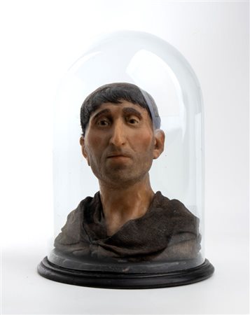 Ceroplastica raffigurante Girolamo Savonarola, entro campana di vetro Ambito napoletano, XVII-XVIII secolo Altezza x diametro scultura: 28 x 27 cm. Altezza con vetro: 37 cm.