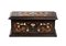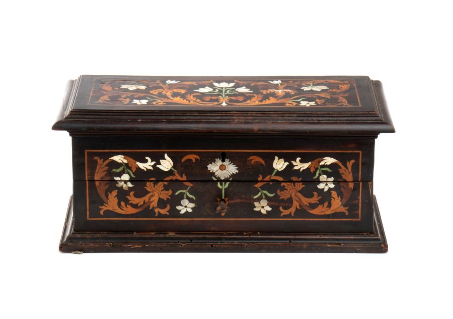 Altezza x larghezza x profondità: 16 x 34 x 15 cm. lastronato in noce e intarsiato con legni da frutta e madreperla con motivi fiorati e floreali. Dotato di con cassetto porta marenghi e coperchio incernierato a celare numerosi scomparti (mancante di chiave).