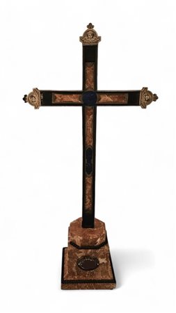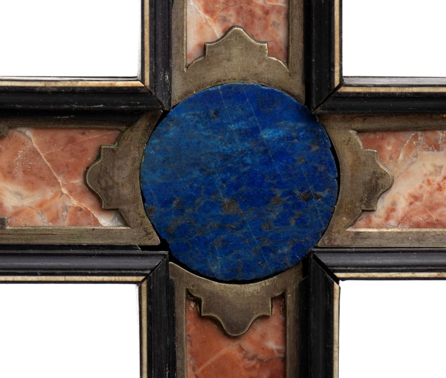 Croce in legno, marmo, lapislazzuli e osso XIX secolo Altezza x larghezza x profondità: 53 x 32 x 2 cm. Peso: 430 gr.