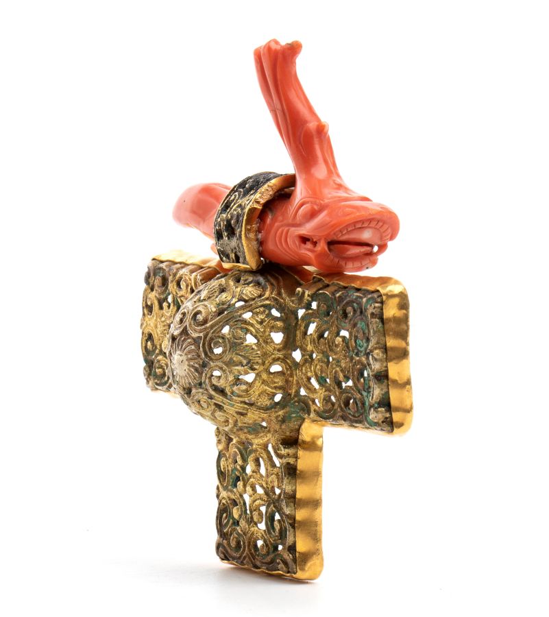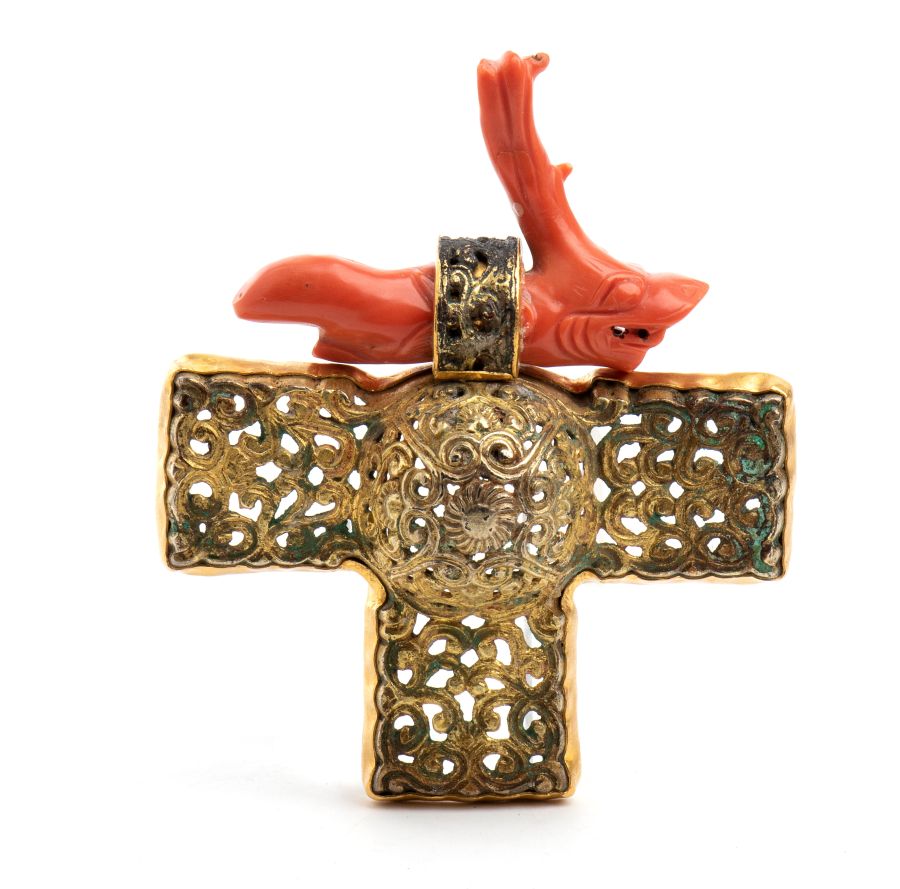 Croce in argento dorato, oro e corallo Cina, XVII secolo Altezza x larghezza x profondità: 9,5 x 8 x 3,2 cm. Peso: 87,5 gr.