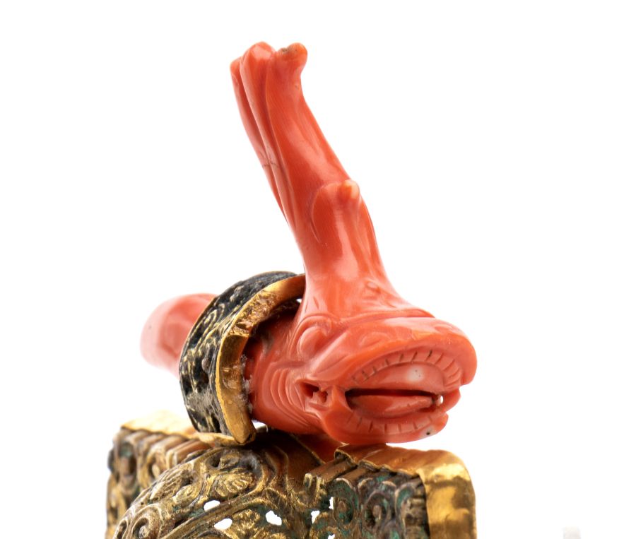Altezza x larghezza x profondità: 9,5 x 8 x 3,2 cm. Peso: 87,5 gr. parte centrale a forma di croce Tao in argento dorato, lavorata a traforo con spirali e motivi floreali, proveniente dalla Cina, intorno al XVII secolo. Montatura moderna in oro 24K con un pesce in corallo Cerasuolo (Corallium Eliatus) nella parte superiore.